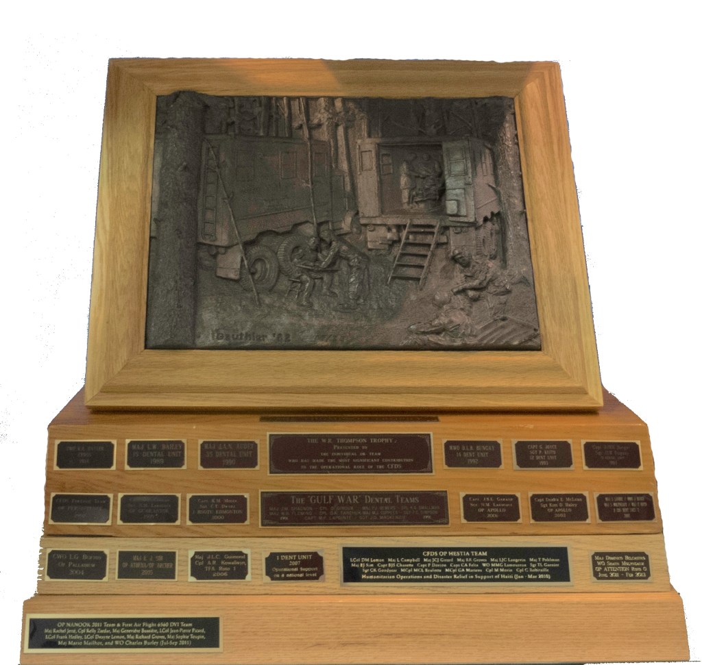 The W.R. Thompson Trophy is presented to the members or group of the RCDC who made the most significant contribution to the land, sea, or air operational role of the RCDC during the last calendar year, or over the past several years. The award recognizes accomplishments in training, operations, development of doctrine or any other aspect of the RCDC operational role.